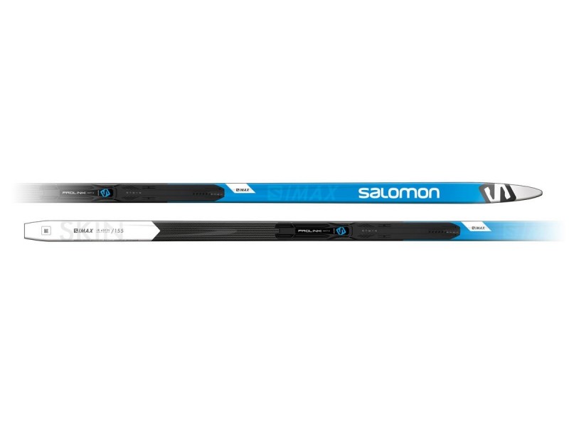 41189800135 juniorské běžky Salomon S/MAX eSKIN Junior styl classic skluznice G5 universal base jádro Densolite 2000 grip technologie eSkinGrip+, v odrazové části nalepovací umělá tulení kůže napuštěné základovým voskem broušené namontovaná deska PSP Prolink shift plate šířka 45/45/45mm délka 135cm