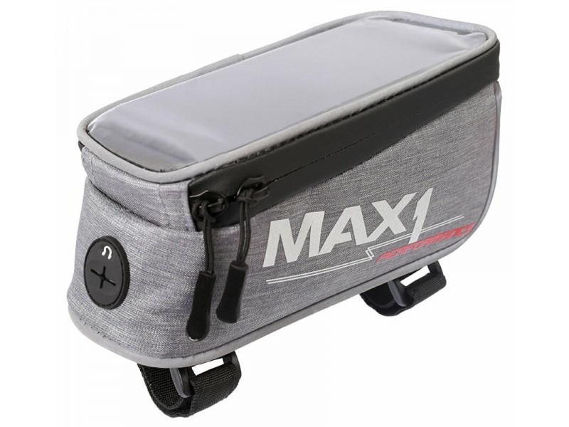 Kompaktní brašna MAX1 na rámovou trubku s kapsou uzpůsobenou pro mobilní telefon. Gumová membrána pro umístění sluchátek ve spodní části brašny. Pasuje na většinu standardních rámů.