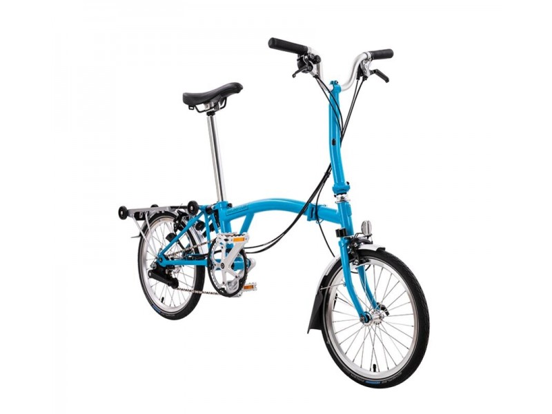 Skládací kolo Brompton M6L v kombinovaném barevném provedení se světle modrým rámem a černými částmi