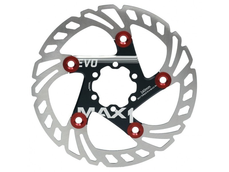 Brzdový kotouč MAX1 Evo 160mm s Alu unašečem.Kotouč je vyroben z vysoce tepelně odolné oceli 410 STAINLESS STEEL, unašeč z AL7075.Povrchová úprava 42HRC.- Tvar kotouče zajišťuje velice dobré chlazení.- Větší brzdná plocha zvyšuje účinnost.- Ultralight design.- Vysoká účinnost za všech podmínek. - Výborná tvarová stálost díky konstrukci s Alu unašečem.- Hmotnost: 120g- Balení obsahuje šrouby.Více na: MAX1.CZDovozcem značky MAX1 do ČR je společnost Cyklomax, spol. s r.o.