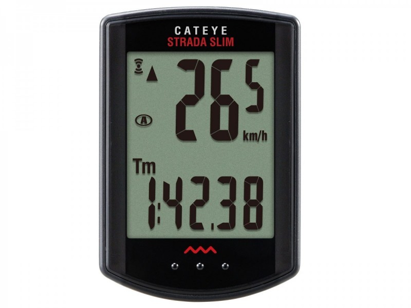 Tenký bezdrátový/beztlačítkový cyklopočítač CATEYE malých rozměrů s velkým displejem a číslicemi. Standardní snímač rychlosti SPD-01. 8 funkcí: denní (1 a 2) / celková vzdálenost, okamžitá / průměrná / max. rychlost, čas jízdy, hodiny, funkce Pacer - indikátor (šipky) poměřující okamžitou a průměrnou rychlost, nastavitelné dva průměry kola a celková vzdálenost, aut. funkce START / STOP, bezdrátový přenos na vzdálenost až 60 cm, otočný držák "Flex-Tight" s univerzální objímkou umožňující připevnění na všechny průměry řídítek nebo představců, k montáži držáku a snímače není potřeba žádné nářadí.