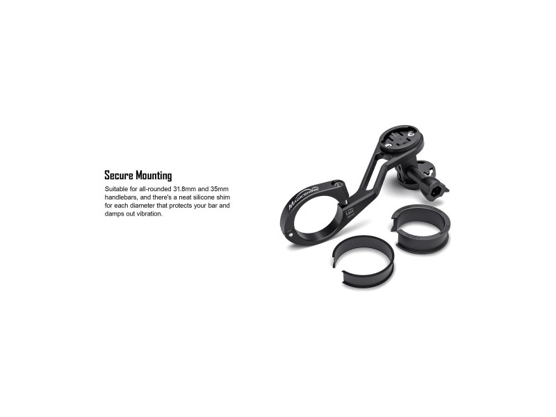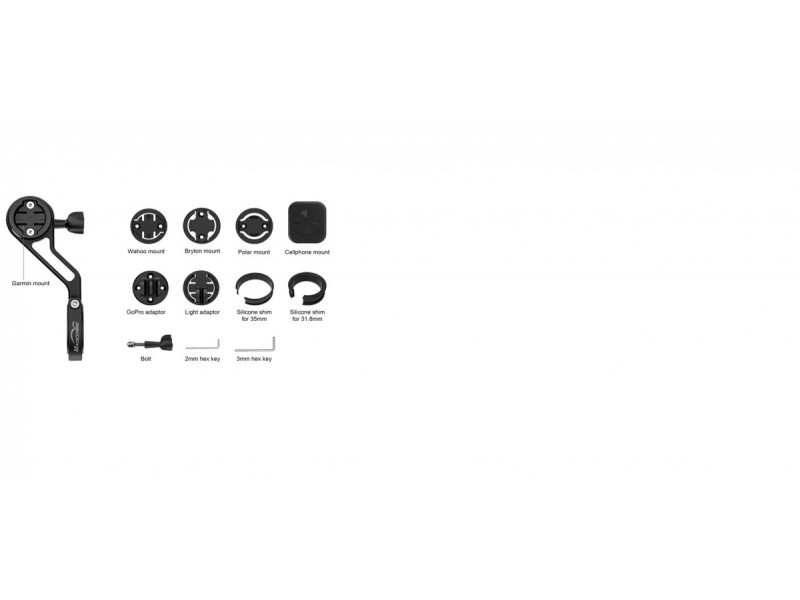 Držák computeru Garmin (Wahoo, Bryton, Polar - modely viz další obrázek ) a světla s úchytem GoPro, držák na mobil do držáku Garmin pro řidítka 31,8 a 35,0 mm včetně silikonové podložky, která ochrání řidítka a zároveň tlumí vibrace materiál AL CNC + plastová vložka na uchycení computeru hmotnost: 41g