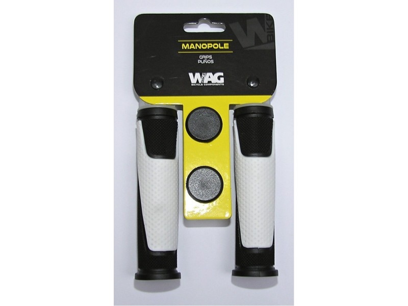 Gumové gripy, dva materiály, pro řidítka průměr 22 mm, průměr pro úchop 30 mm, délka 125 mm, barva černá/bílá.