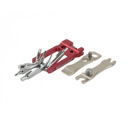 Sada imbusových klíčů 2/ 2,5/ 3/ 4/ 5/ 6/ 8 mm, šroubovák PH2/SL5, 2 ks montážní páky, 8/ 10 mm strannový klíč, centrovací klíč 0.130"/0.136"/0.156" a 2, nýtovač řetězu. Neoprenová kapsa. Materiál: Cr-V ocel s Ni úpravou. Váha 124 g, rozměr 77x15x40 mm.