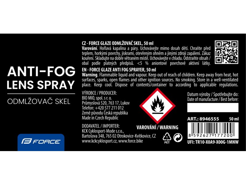 Odmlžovač skel brýlí FORCE GLAZE, rozprašovač 50 ml