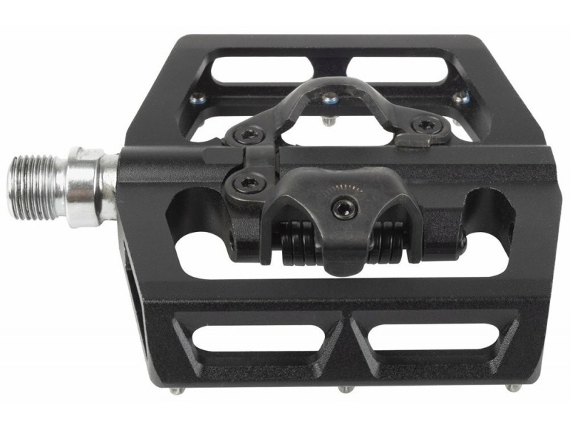 Platformové pedály M-Wave kombinovéné s nacvakávacím pedálem s možností použití kufrů SPD.