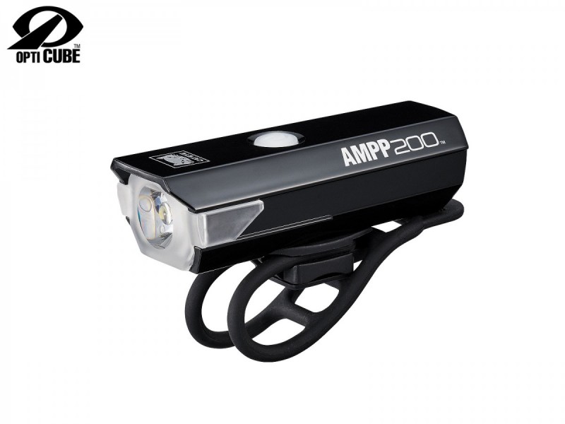 CATEYE AMPP200 je přední dobíjecí světlo s technologií OptiCube (speciální konstrukce optických čoček usměrňující tok světla pro lepší osvícení vozovky). Ve vypínači je zabudovaný indikátor kapacity akumulátoru a dobíjení , které se provádí přes USB 2.0 / Micro-B kabel, jež je součástí balení.
