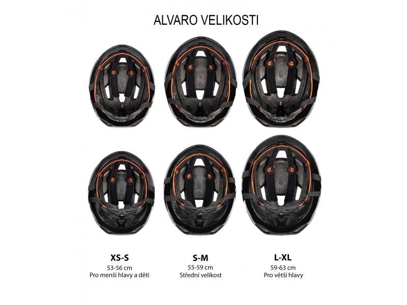 Přilba ALVARO je k dispozici ve třech velikostech: XS-S (53-56 cm), S-M (55-59 cm) a L-XL (59-63 cm), což zaručuje perfektní fit pro širokou škálu velikostí hlavy.