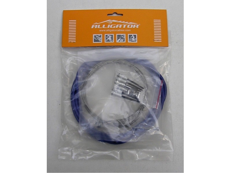 Aligator sada brzdového bovdenu průměr 5mm modrý,délka 2300mm,brzdové lanko nerez průměr 1,6mm,délka 1000mm,na jedné straně příčná MTB koncovka, na druhé osazená silniční koncovka,brzdové lanko nerez průměr 1,6mm,délka 2000mm,na jedné straně příčná MTB koncovka, na druhé osazená silniční koncovka,4xkoncovka bovdenu AL s krytem lanka,2x koncovka bovdenu AL,2x koncovka lanka,1x gumová ochrana lanka,2x gumový korálek na lanko