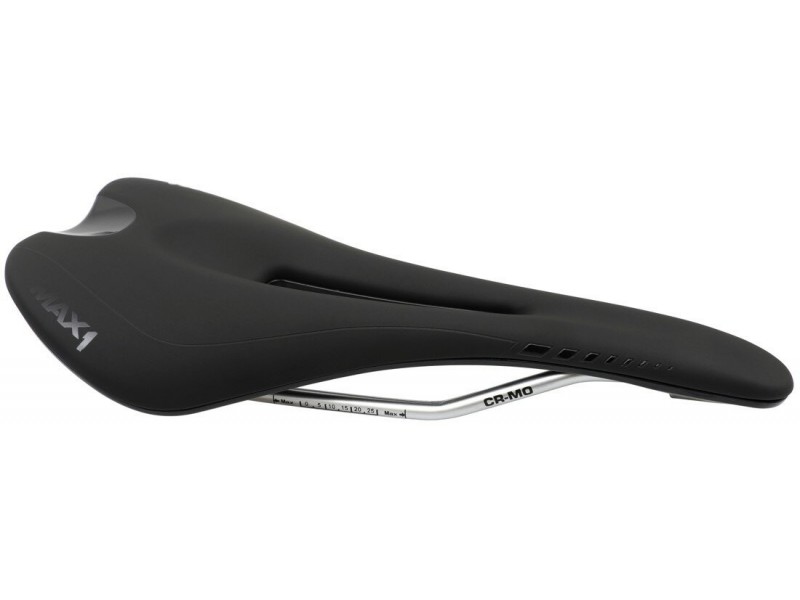 Závodní sedlo MAX1 Evo s Cr-Mo ližinami, nylonovou platformou a ergonomickým otvorem ve střední části.
