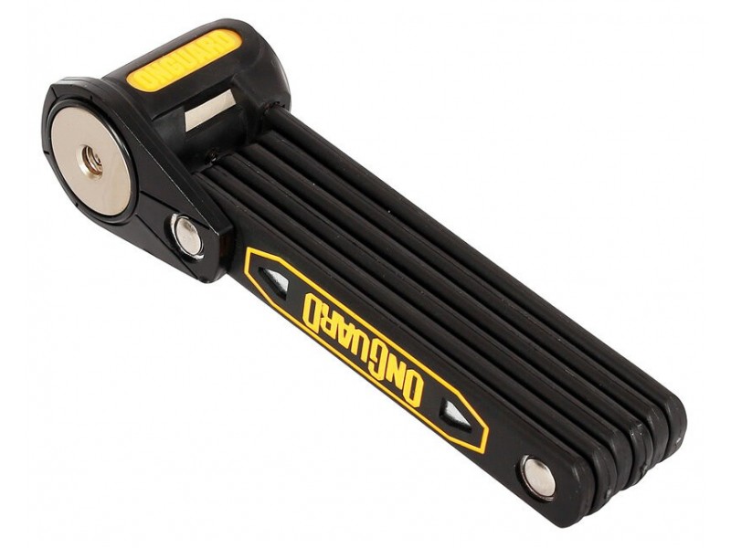 Efektivní, jednoduchý a vysoce účinný skládací zámek ONGUARD. Zámek je lehký, snadno použitelný a nabízí zabezpečení blížící úrovni U-zámků, ale s jednodušší manipulací, při menších rozměrech. Kalené články s dvojitým potahem plastu a žluté gumy dokonale chrání před odřením. Vhodný pro jízdní kola, motocykly, brány a další.