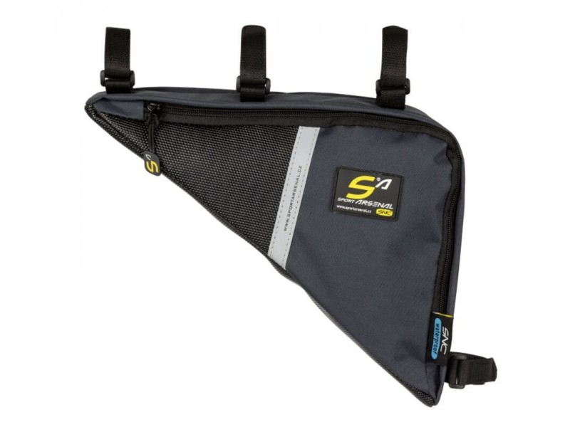 Naprosto nejzákladnějším úložným prostorem na kole je základní trojúhelníková rámová taška. Tento konkrétní typ od Sport Arsenal vhodný na speciální a náročnou cykloturistiku (SNC) z tohoto typu brašny vytěžil maximum. Díky celkovému objemu 1,3 litru pojme veškerý nutný náklad a přitom nijak neomezuje pohodlí při jízdě.