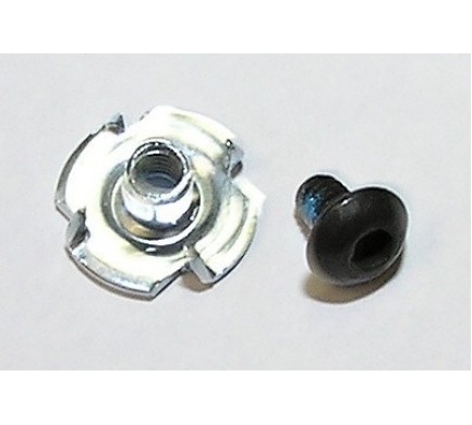 Stříbrný šroub M4x8 se zapuštěnou hlavou a velkoplošná matice pro uchycení přezky sjezdových bot