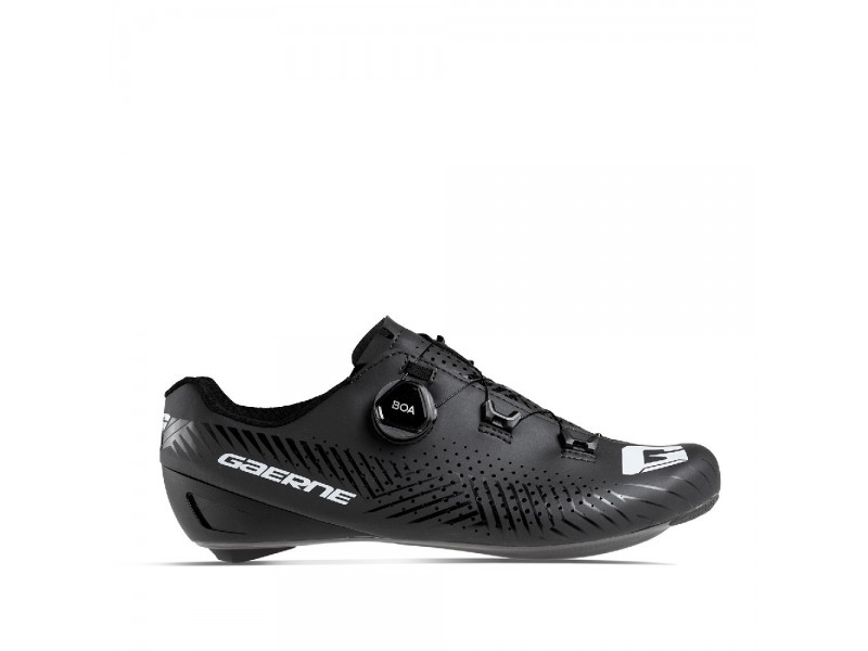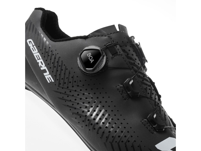 3670-001 Tretry G.TUONO jsou navrženy tak, aby kombinovaly výkon a pohodlí, a jsou ideální pro ty, kteří hledají ideální poměr cena/výkon. Svršek se systémem G.AIR VENTED zaručuje maximální ventilaci díky přítomnosti otvorů o proměnlivém průměru na celé vnější i vnitřní straně boty až po přední část a na jazyku. Systém zapínání s mikro nastavitelným kolečkem BOA L6 DIAL C spolu s 5 vodítky tkaniček umístěnými na velké ploše svršku zaručuje rovnoměrné zapínání a rozložení tlaku po celé délce nártu. Vnější část kolečka BOA je vyrobena z měkké gumy, která zajišťuje vynikající přilnavost při používání. INTEGRATED ANTI SLIP HEEL CUP: Zcela nová integrovaná protiskluzová pata se nedeformuje ani neoslabuje. Díky svému tvaru působí proti zánětu šlach, umožňuje nejlepší stabilitu a kontrolu chodidla. Podrážka GAERNE EPS CARBON POWER SOLE 8.0 je vyrobena z nylonu obohaceného o karbon pro zajištění optimální tuhosti. Tenká tloušťka zaručuje kulaté šlapání bez rozptylu energie. Stabilita nohy je zvýšena díky tvaru podešve v oblasti plantární klenby. Pět větracích otvorů zajišťuje ventilaci uvnitř boty. Podešev má protiskluzovou vložku ve špičce a výměnnou podpatěnku v zadní části. Zarovnávací stupnice vytištěná na podrážce vám umožňuje zapamatovat si polohu zarážky. Možnosti polohy zarážek byly ve srovnání s předchozí podrážkou zvětšeny o 9 mm. Kompatibilní s většinou dostupných nášlapných pedálů. Vynikající index tuhosti 8,0.
