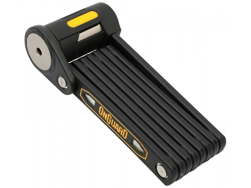 Efektivní, jednoduchý a vysoce účinný skládací zámek ONGUARD. Zámek je lehký, snadno použitelný a nabízí zabezpečení blížící úrovni U-zámků, ale s jednodušší manipulací, při menších rozměrech. Kalené články s dvojitým potahem plastu a žluté gumy dokonale chrání před odřením. Vhodný pro jízdní kola, motocykly, brány a další.