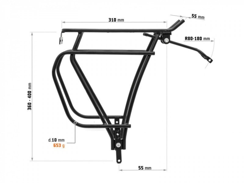 - Integrovaná boční trubička umožňuje nižší uchycení postranních brašen a zvětšuje tak horní ložnou plochu nosiče.