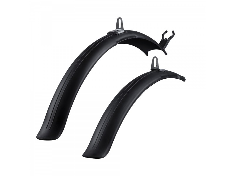 sada predný + zadný blatník vhodná pre MTB 24" / 26" bicykle s kovovým držiakom, dlhá rukoväť šírka blatníka: 57 mm materiál: plast, čierna farba hmotnosť: 226 g balené v taške vyrobené v Českej republike