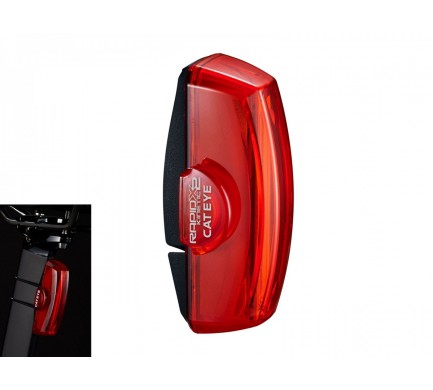 Zadné "brzdové" svetlo - blikačka CATEYE využívajúca LED v pásiku. Vysoko výkonné svetlo (50 lm a rozsah 180°) využívajúce technológiu, ktorá vie rozpoznať spomalenie. Vždy keď spomalíte sa svetlo prepne do najvyššej intenzity svietenia (na 2,5s) a upozorní jazdca/vodiča za vami, že brzdíte. Uchytenie pomocou gumičky. Kontrolka na stav batérie a automatické prepnutie do režimu blikania pokiaľ sa kapacita batérie výrazne zníži. Svetlo je napájané Li-Pol batériou s USB nabíjaním - micro B konektor (2h). 3 režimy svietenia - blikania s výdržou: 5 h - konštantné svietenie a až 30 h blikania podľa vybraného režimu.