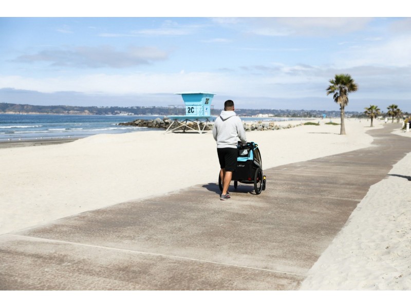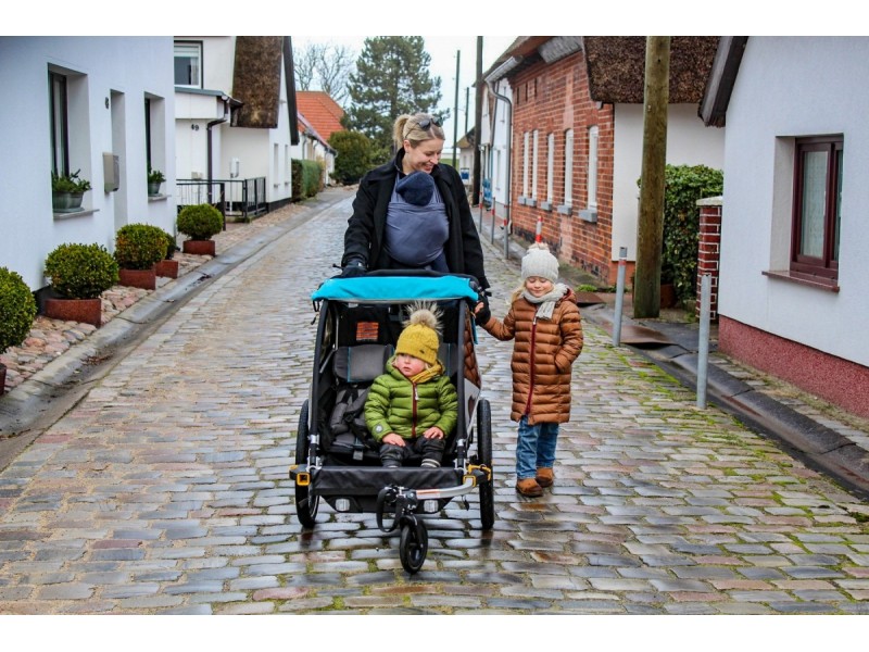Ďalšími prvkami, ktoré výrazne zvyšujú komfort malých prckov sú veľké zatmavené okienka s UV ochranou, vnútorné vrecká na odkladanie hračiek, ale aj občerstvenia, či nastaviteľná slnečná clona. Rodičov dozaista nadchne výškovo nastaviteľné madlo, ktoré sa pri jazde za bicyklom premiestni vpred a zvyšuje tak bezpečnosť detí. Alebo ho môžete využiť pre prevoz odrážadla či dokonca detského bicykla. Zásadný je vodovzdorný materiál s vodovzdornými zipsmi pri prednej roletke a ľahké ovládanie všetkých prvkov ako je parkovacia brzda, montáž prídavných detských setov alebo nastaviteľného madla.