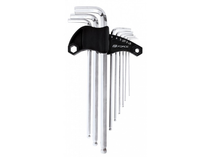 sada 9 ks inbusov SHAPED: 1,5 / 2 / 2,5 / 3 / 4 / 5 / 6 / 8 / 10 mm s guľôčkou na konci, v plastovom držiaku materiál: nástrojová oceľ Cr-V, pochrómovaná hmotnosť: 430 g, balené v blistri FORCE na použitie PROFI