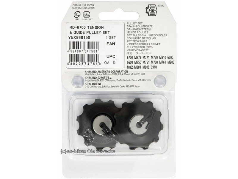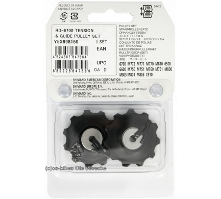 Kladky do prehadzovačky Shimano 10 speed, napínacia kladka - ložisko, vodiaca kladka - keramické púzdro. Vhodné pre cestné a MTB prehadzovačky RD 6770, 6700, 6600, 6500, M772, 771, 770, 761, 760, 751, 750, M810, 806, 805, 801, 800, T780, 1 pár.