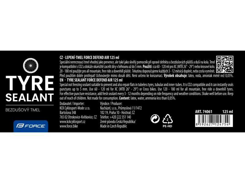 FORCE Defend Air je tmel špeciálne vyvinutý na prevenciu prepichnutia vhodný pre všetky typy bezdušových pneumatík, galusiek a duší dokáže utesniť diery s priemerom až 5 mm tmel je kompatibilný aj s predajom nemrznúcich zmesí CO2 a je balený v 125 ml fľaši s aplikátorom