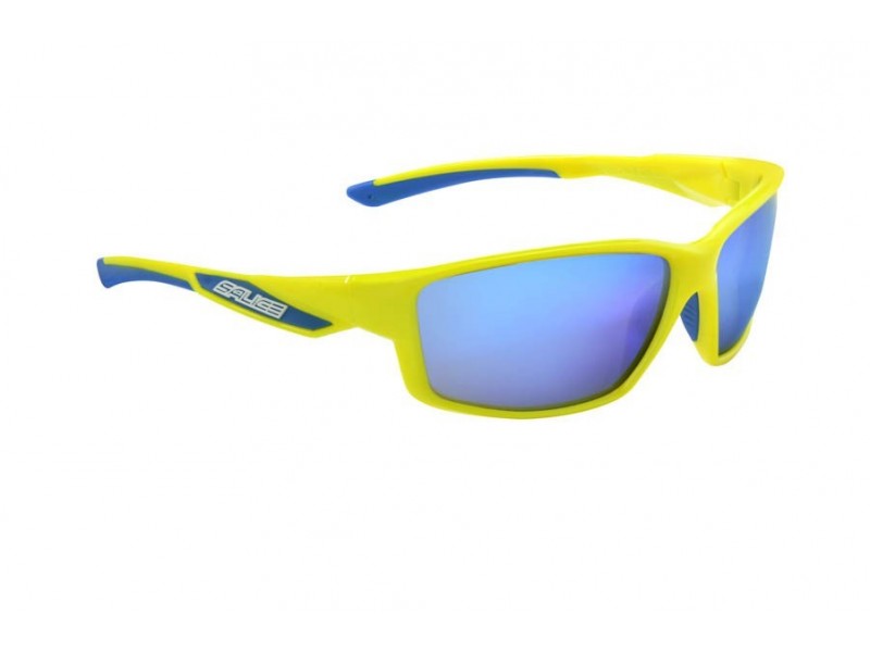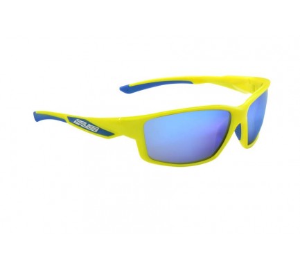 Okuliare majú svietivo žltý rámček s modrými sklami a modrými doplnkami.