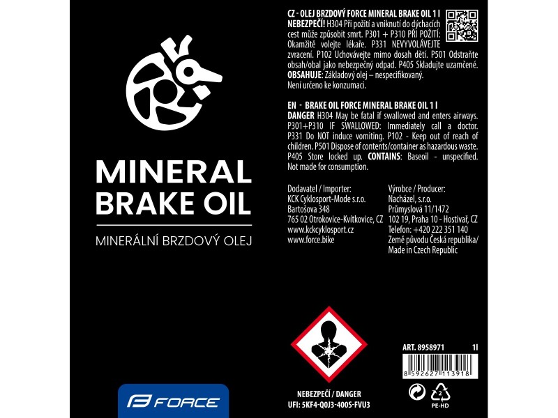 minerálny brzdový olej FORCE Brake Oil, pre hydraulické brzdy s možnosťou použitia minerálneho oleja "MINERAL" ( pre SHIMANO , MAGURA atď... ) predaj a balenie po 1 l fľaši