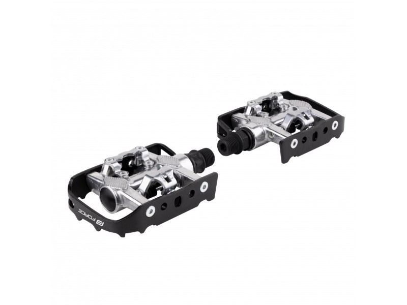 jednostranný FPC systém FPC pedále - FORCE Pedal Click kompatibilné s guličkovými ložiskami SHIMANO SPD SM-SH51/56 materiál: hliníkové telo pedálu, Cr-Mo os platforma rozmery: 102x66x30 mm nastaviteľné predpätie pružiny, železná klietka vrátane čiernych zarážok (náhradné zarážky kód68285)náhradné zarážky kód: 68321 hmotnosť 1 páru: 469 g, zarážky: 52 g balené na FORCE karte