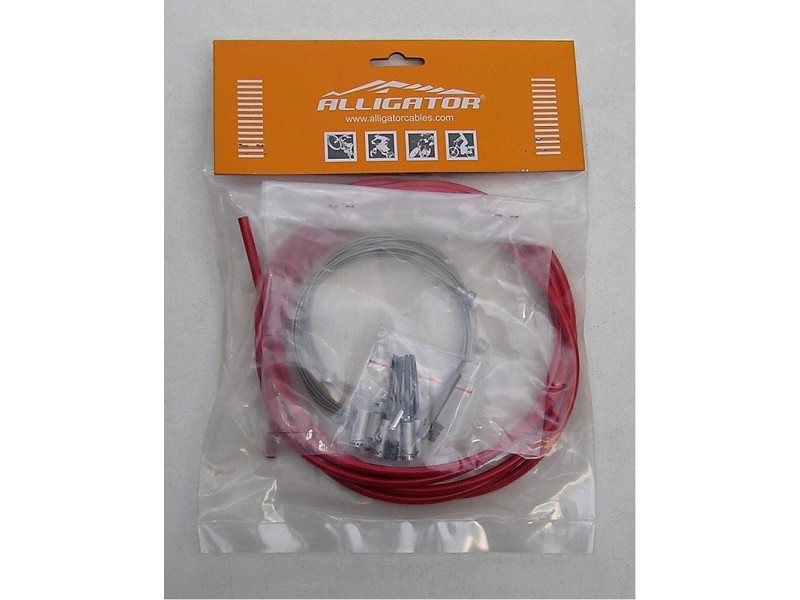 Aligator sada brzdového bovdenu průměr 5mm červený,délka 2300mm,brzdové lanko nerez průměr 1,6mm,délka 1000mm,na jedné straně příčná MTB koncovka, na druhé osazená silniční koncovka,brzdové lanko nerez průměr 1,6mm,délka 2000mm,na jedné straně příčná MTB koncovka, na druhé osazená silniční koncovka,4xkoncovka bovdenu AL s krytem lanka,2x koncovka bovdenu AL,2x koncovka lanka,1x gumová ochrana lanka,2x gumový korálek na lanko