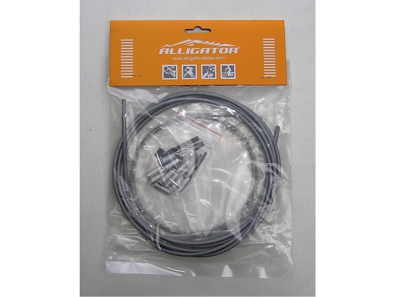 Aligator sada řadícího bovdenu průměr 4mm šedý,délka 2300mm,řadící lanko nerez průměr 1,2mm,délka 1500mm,řadící lanko nerez průměr 1,2mm,délka 2000mm,7xkoncovka bovdenu AL s krytem lanka,3x koncovka bovdenu AL,2x koncovka lanka,1x gumová ochrana lanka,2x gumový korálek na lanko