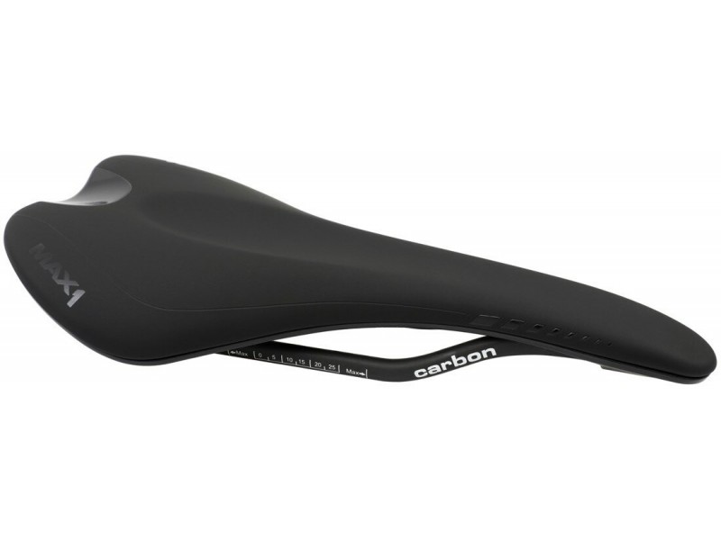 Pretekárske sedlo MAX1 Evo s karbónovými lyžinami a karbónovou platformou.