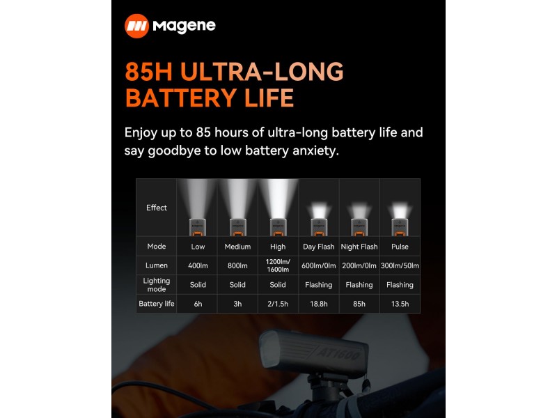 MAGENE AT1200 je chytré přední světlo na kolo s výkonem až 1200 lumenů, které zaručuje vynikající viditelnost i v těch nejnáročnějších podmínkách. Díky širokému 120° světelnému paprsku si užijete bezpečnou a pohodlnou jízdu, ať už dojíždíte do ´ práce, trénujete nebo jezdíte v noci. Klíčové vlastnosti: Vysoký výkon až 1200 lm - Jasný a široký světelný paprsek pro lepší viditelnost. Přednastavené režimy v aplikaci ONE LAP FIT - Možnost přizpůsobit si světlo podle svých potřeb. Kompatibilita s cyklistickými počítači Garmin a Magene - Ovládejte světlo přímo ze svého zařízení. Kompatibilní modely: Garmin Edge 530/540/840/1040/1050 a další budoucí modely, Magene C506/C606 a další budoucí modely. 10 světelných režimů - Vyberte si z denního, nočního, blikajícího, pulzujícího a dalších. Dlouhá výdrž baterie až 85 hodin - Žádné obavy z vybití baterie během dlouhých jízd. Stav baterie přehledný na první pohled díky tříbarevnému indikátoru. Podporuje instalaci nad i pod řídítka. Vybaveno šňůrkou proti pádu Stupeň krytí IPX6 - Odolnost vůči dešti a drsným podmínkám. Nabíjení přes USB-C + podpora externího napájení - Rychlé nabíjení a možnost nabíjet telefon nebo počítač na kole. Systém proti oslnění - Chrání protijedoucí cyklisty před nepříjemným osvětlením. Rychlé nabití za 2,5 hodiny přes USB-C a dlouhá výdrž baterie dělají ze světla MAGENE AT1200 spolehlivého společníka na každou jízdu! Technické údaje: Rozměr: 111,4 x 26,1 x 34,1 mm Hmotnost: 162 g Kapacita baterie: 5000 mAh Materiál: slitina hliníku Odolnost: IPX6 Počet světelných režimů: 10 Bezdrátový protokol: Bluetooth, ANT+ Dosah: 200 m Úhel: 120° Maximální svítivost: 1200 lm Životnost baterie: vysoký jas 2 h / noční blikání 85 h Nabíjecí port: USB-C Doba nabíjení: 2,5 h Rozsah provozních teplot: -10°C až 50°C Instalace nad/pod řídítka Obsah balení: světlo AT1200, držák (pro instalaci nad řídítka), závěsný držák (pro instalaci pod řídítka), kryt, nabíjecí kabel USB-C na USB-C, plochý šroubovák, 3ks šroubů, jistící šňůrka, torx klíč.