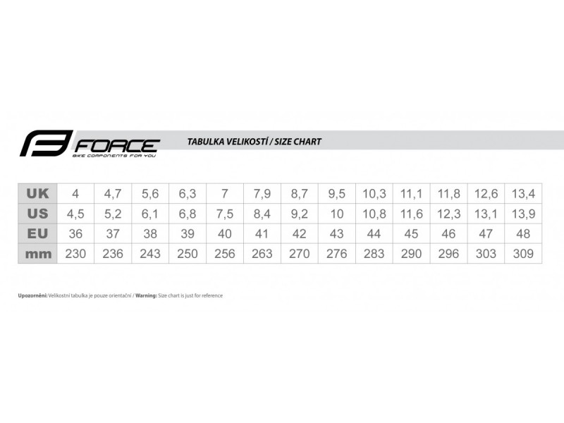 zvršok: syntetická koža podrážka: nylonová kompozitná index tuhosti: 6 hmotnosť: 270 g (1/2 páru veľkosť 42) zapínanie na 3 suché zipsy zosilnená päta a špička špička chránená gumovým okrajom voči špičke vetracie otvory pre výbornú priedušnosť anatomická stielka vnútorná časť z protišmykového materiálu LOOK, kompatibilný s SPD-SL reflexný prvok na päte zarážky nie sú súčasťou balenia veľkosť zodpovedá štandardu civilnej obuvi balené v krabici FORCE