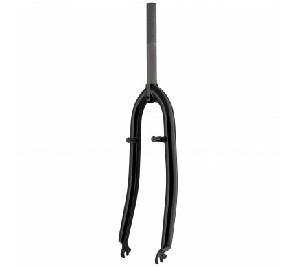 28" trekingová vidlica pre V-brzdy, čierny lesk 1" stĺpik, dĺžka: 200 mm/ 100 mm priemer hlavového zloženia závit: 26,4 mm kované koncovky so závitom pre blatníky materiál: oceľ hmotnosť: 1134 g ( niektoré vidlice majú nálepku 24" )